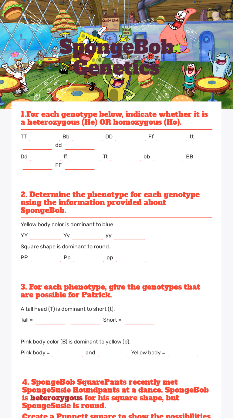 Spongebob genetics answer key each question spongebob genetics answer key. Create a punnett square to show the possibilities that would result if spongebob and spongesusie had children.